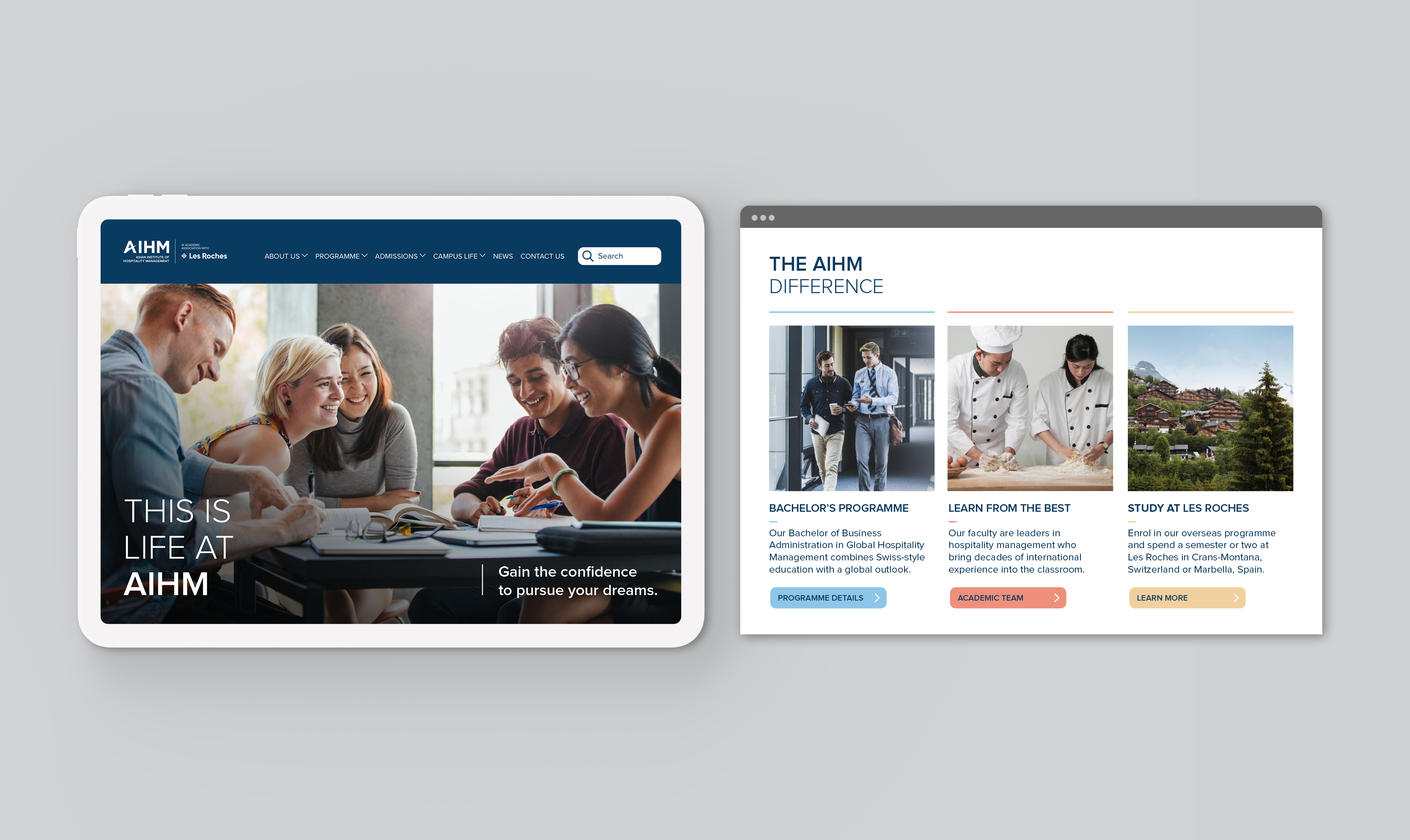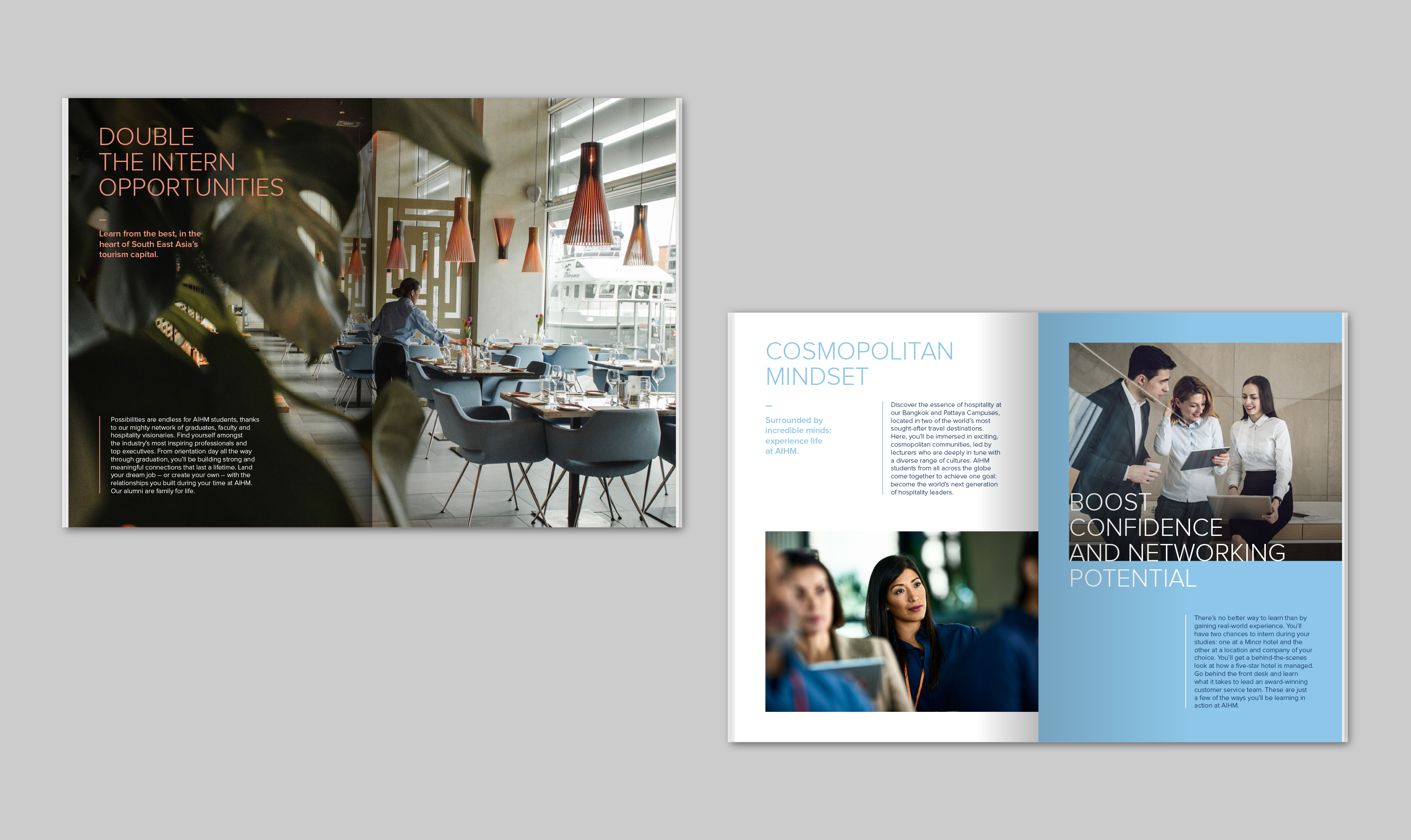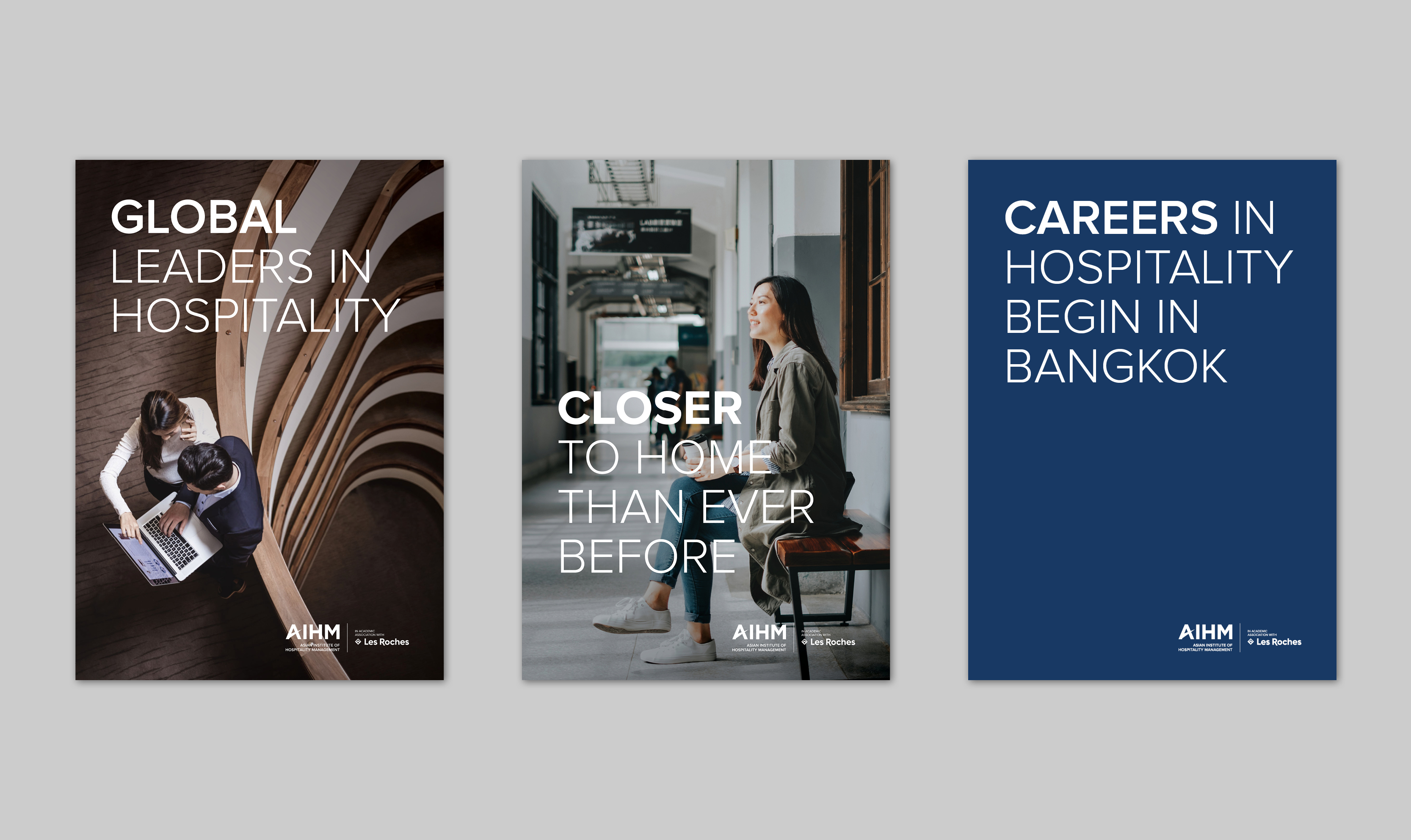 To communicate the brand concept ‘Leading hospitality excellence’, the modern visual identity introduces the simplified color palette, layouts and photography styles that make AIHM communication clean, vibrant and relevant that reinforces the AIHM bold and forward-thinking direction.